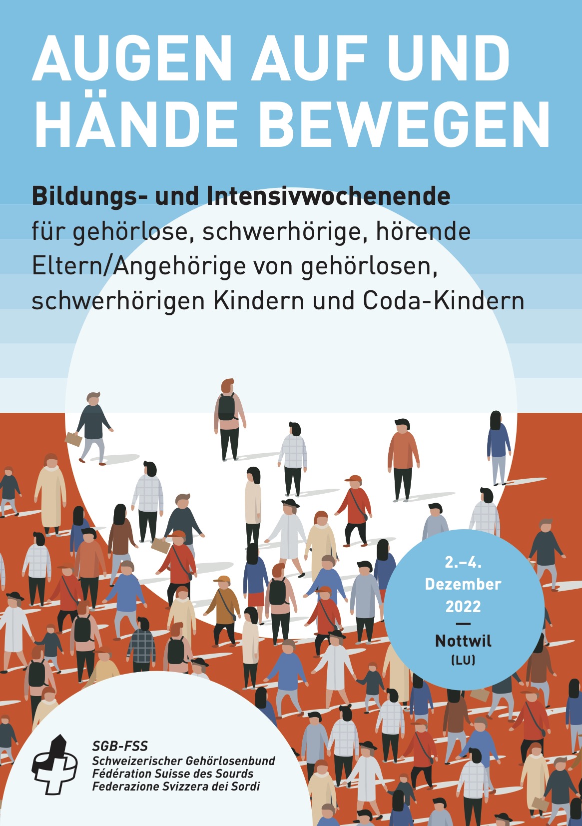An diesem Bildungs- und Intensivwochenende bieten wir euch vielfältige Bildungseinheiten an, bezogen auf Themenschwerpunkte in der gehörlosen Welt: Filmabend, Gebärdensprachkurse, sowie fachliche Inputs zu Paradoxen in der Gebärdensprachgemeinschaft und zur sozial-emotionalen Entwicklung von gehörlosen und schwerhörigen Kindern.