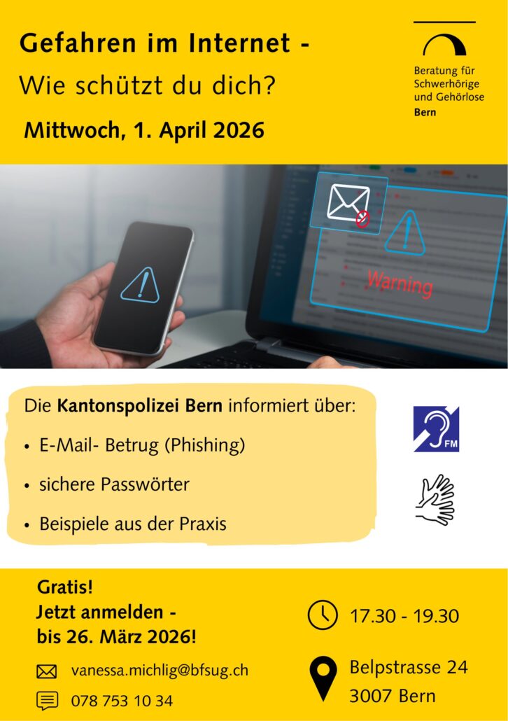 Die Beratung für Schwerhörige und Gehörlose Bern lädt zu einem Informationsabend zum Thema „Gefahren im Internet – Wie schützt du dich?” ein.
