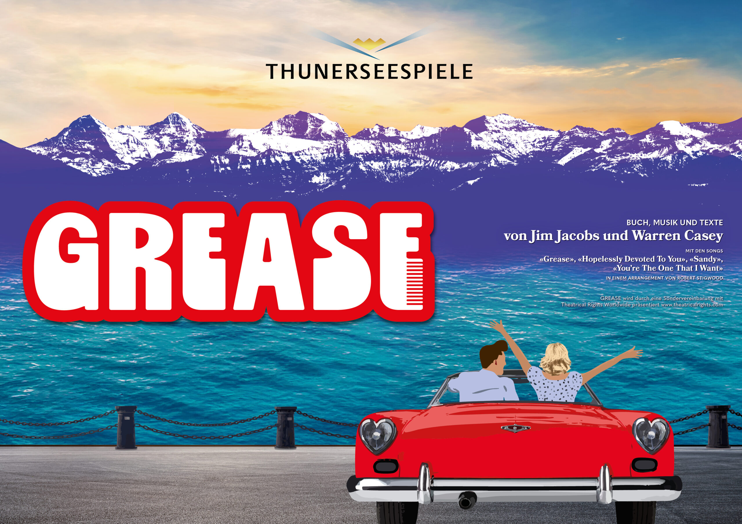 Im Vordergrund steht ein rotes Cabriolet, von hinten zu sehen. Darin sitzen zwei Personen, die fröhlich die Arme heben, als würden sie den Moment feiern. Vor ihnen glitzert der Thunersee in kräftigem Türkis. Dahinter ragen die verschneiten Alpen in die Höhe, violett getönt wie ein Bühnenhintergrund kurz vor der Premiere. Oben im Bild prangt das Logo der Thunerseespiele. Links steht gross ‹GREASE› in roter Schrift mit einem stilisierten Kamm. Die Szene wirkt wie ein Versprechen auf Sommer, Musik und eine Prise Rock’n’Roll.