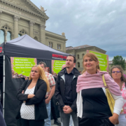 Sie schützen die Schachtel mit den Unterschriften vor dem Regen, von links: Anny Geisser, Beat Ledermann und Tanja Krebedünkel, Politisches Empowerment des Schweizerischen Gehörlosenbundes SGB-FSS